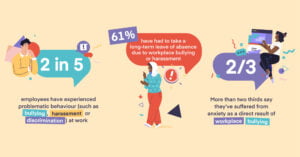 Nearly 15% of people experience mental health challenges in the workplace and 34% say work is the biggest cause of stress in their lives. Whilst there are multiple potential causes of poor wellbeing, including being over-stretched, or under-paid, our research has highlighted the impact of problematic behaviour such as bullying, discrimination or harassment. 2 in 5 people have experienced culture-damaging behaviours at work, it’s an issue that is pervasive, and prevalent. However it’s also an issue that can be overcome, with the correct awareness, and intervention strategy.